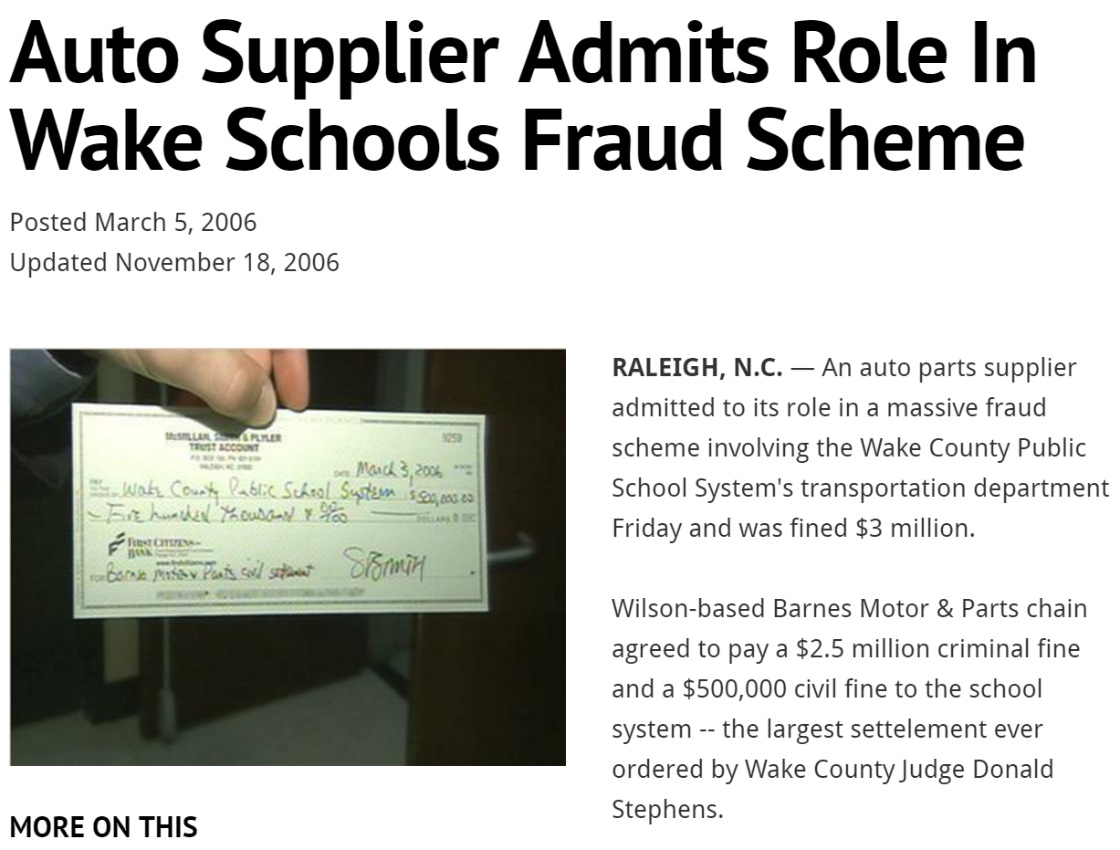 Wake County was able to claw back 5 million dollars and Barnes Motor and Parts paid back 3 million dollars, including a $2.5 million criminal fine.