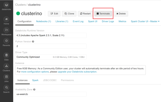 Your cluster terminates after 2 hours of inactivity. You can also terminate the cluster early.
